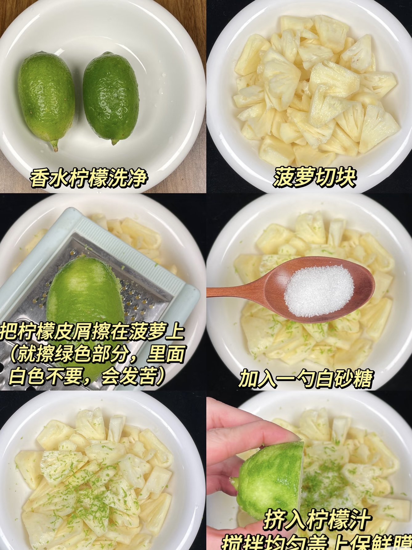 先说选料。菠萝别挑“纹身”多的,金黄带青、叶子翠绿的最精神;香水柠檬比普通柠檬香三倍,皮薄汁多,轻轻一划就能闻到清冽的柠檬雨。再备一勺白砂糖、一点点盐,齐活!工具只要一把刀、一个碗、一张保鲜膜,极简到怀疑人生。