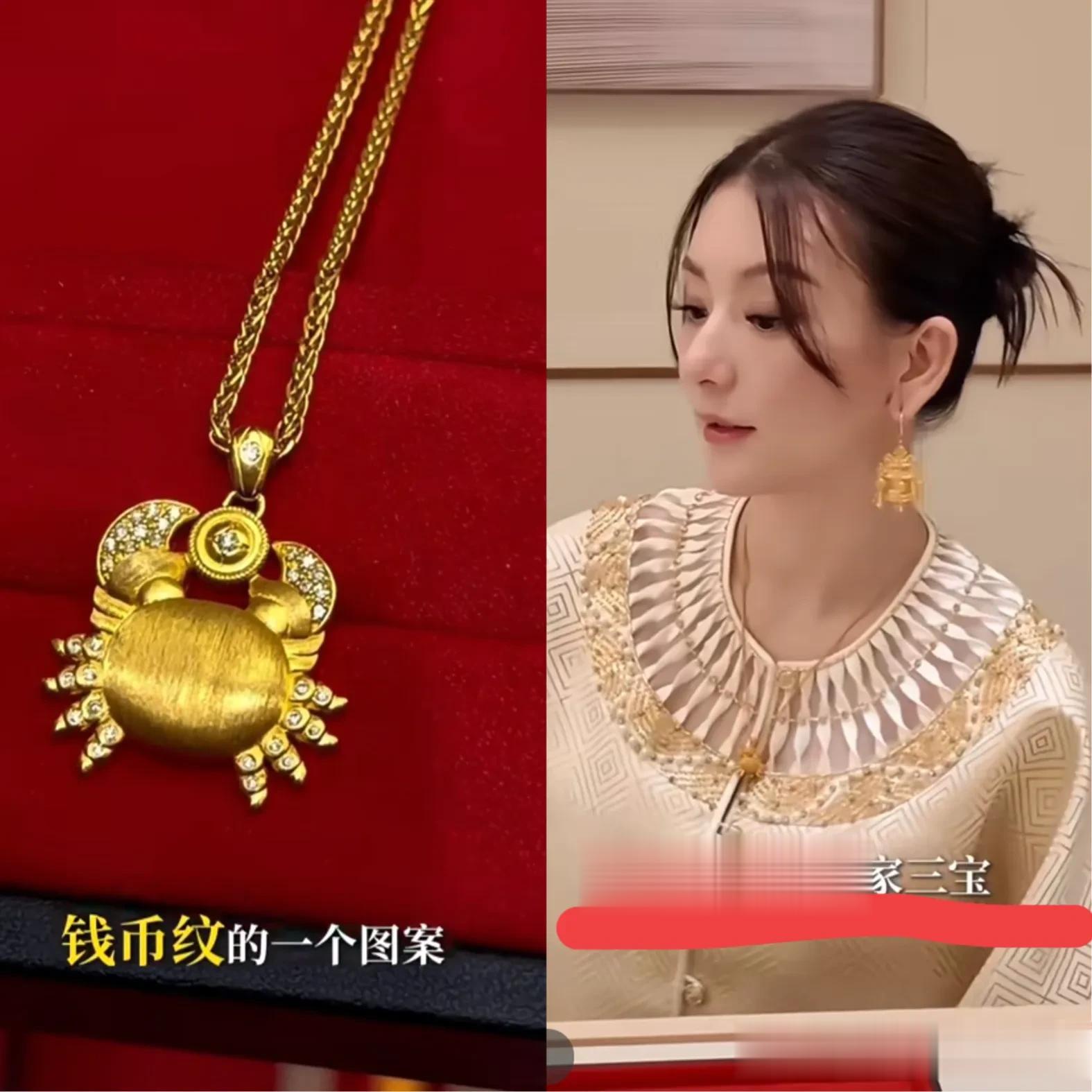 她试戴了好几款看起来就很“豪”的金饰。