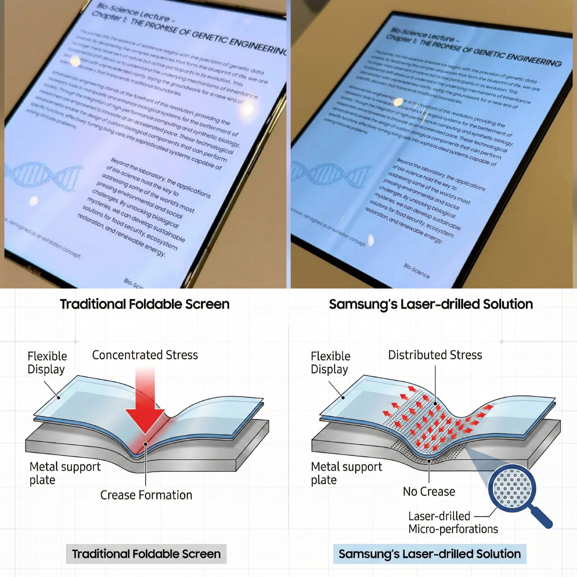 真不愧是国际屏幕大厂!三星在 CES 2026 秀了块“无折痕”折叠屏,那平整度,确实是相当惊艳!不过更劲爆的消息是:苹果居然在向OPPO取经?首先是大V解读了三星的“黑科技”,原理一点不玄乎,反而很巧妙,三星是在金属支撑板上“打孔泄洪”! 通过激光钻孔技术分散应力,让每次弯折的力都“雨露均沾”,不再集中压死一个点,所以,折叠屏的折痕,可能真的要彻底消失了!