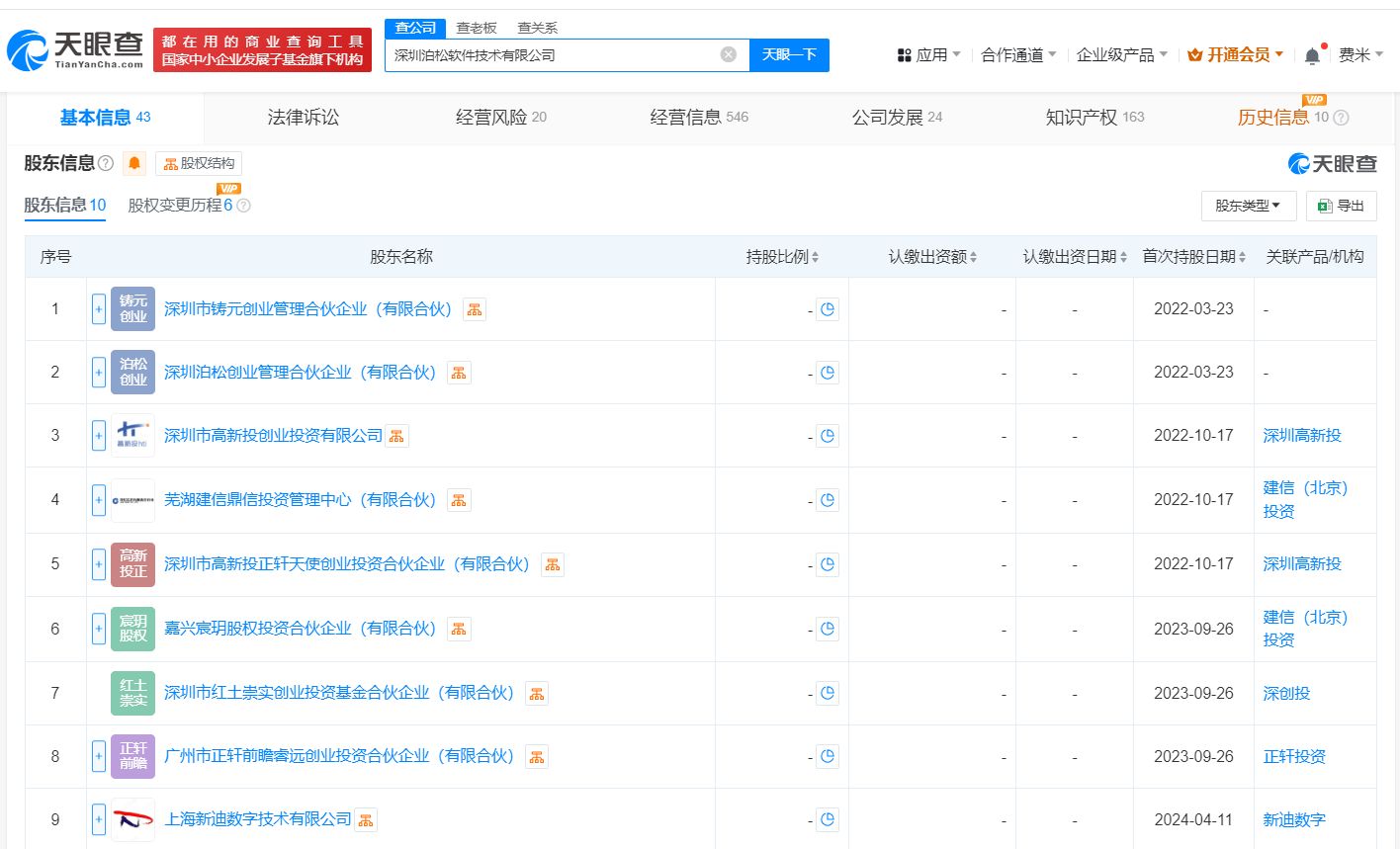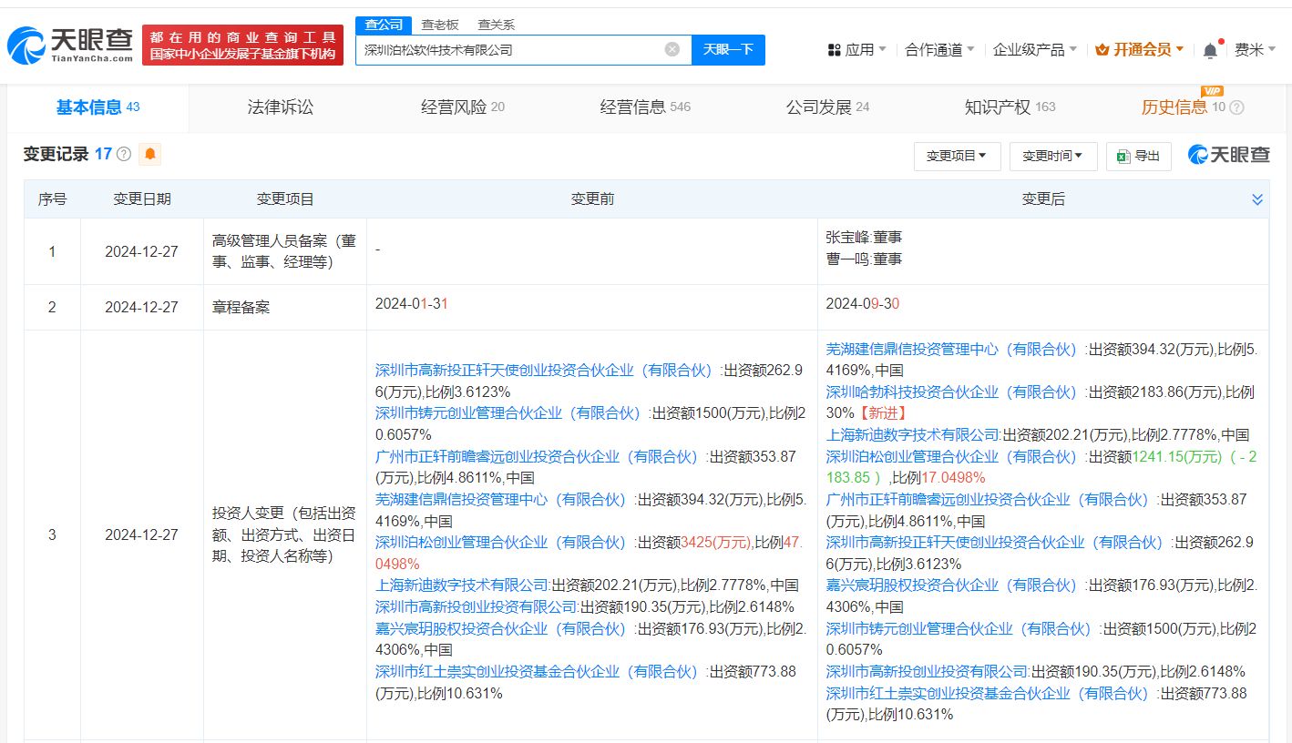 天眼查App显示,近日,深圳泊松软件技术有限公司发生工商变更,新增华为旗下深圳哈勃科技投资合伙企业(有限合伙)为股东。