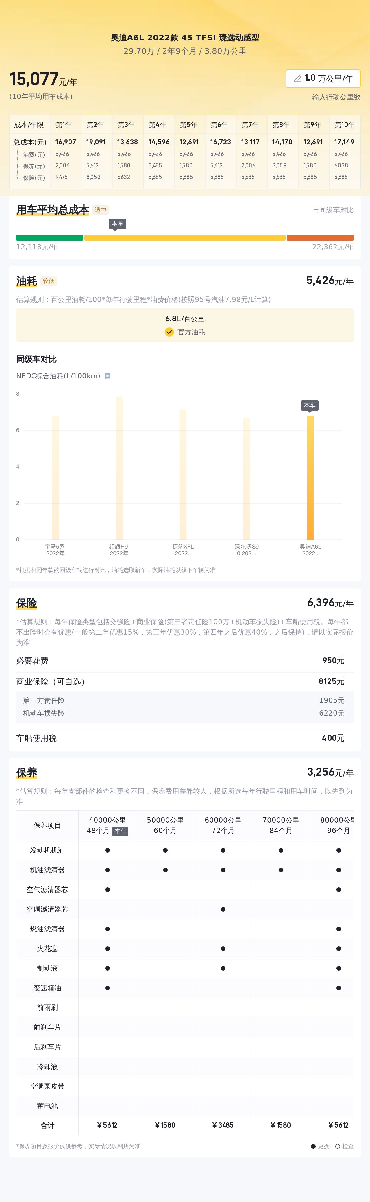 除了市场行情,我们还估算了这辆车的用车成本,以及对比分析了该车在功能配置、动力、空间等方面的市场表现,让您全方位了解这辆车的整体情况。