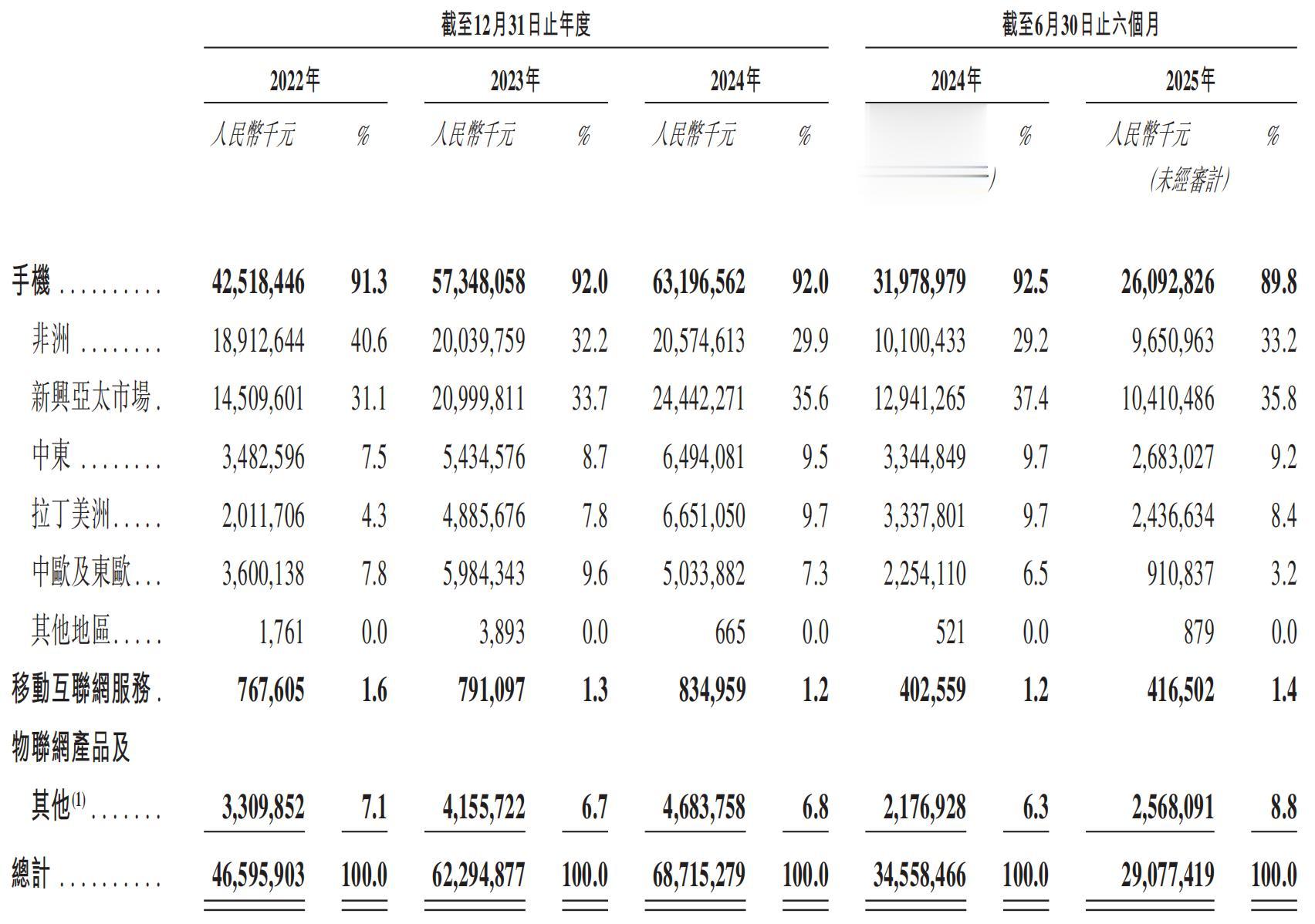 按照地域划分,非洲市场的营收贡献度最高,长期维持在三成左右。2022年至2024年,该市场收入分别为189.13亿元、200.40亿元和205.75亿元,呈现逐年上升态势。2025年上半年,非洲市场的收入曲线首次调头向下,同比下降4.45%至96.51亿元。与之对应的是,传音控股在非洲市场的手机销量由2024年上半年的5162.1万部下降18.90%至2025年上半年的4186.5万部。