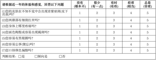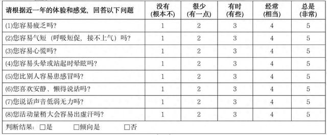 气虚质: 易患感冒易疲倦,气短心慌头晕沉。喜静懒言身无力,稍一活动汗全身。 阳虚质: 畏寒肢冷易感冒,怕吹冷风和空调。穿衣饮食皆需热,稍冷即觉吃不消。 阴虚质: 两颧潮红身烘热,手心脚心常发烫。口鼻眼睛皮肤燥,唇红便秘小便黄。 痰湿质: 满面油光大肚汉,胸闷腹胀身不舒。稍动易汗眼睑肿,痰多口黏咽中堵。 湿热质: 油光满面生痤疮,口苦口臭小便黄。大便黏滞解不尽,阴部潮湿白带黄。 血瘀质: 面色晦暗斑黄褐,皮下无故有瘀斑。唇黯健忘黑眼眶,身有疼痛常不安。 气郁质: 闷闷不乐疑神鬼,焦虑不安易紧张。多愁善感心脆弱,唉声叹气常失望。 特禀质: 冷热异味易咳喘,喷嚏流涕鼻敏感。皮肤划痕起风团,或见皮肤有瘀斑。 平和质: 精力充沛不疲倦,睡到天亮不失眠。记忆力好不健忘,适应外界能力强。九大体质养生攻略