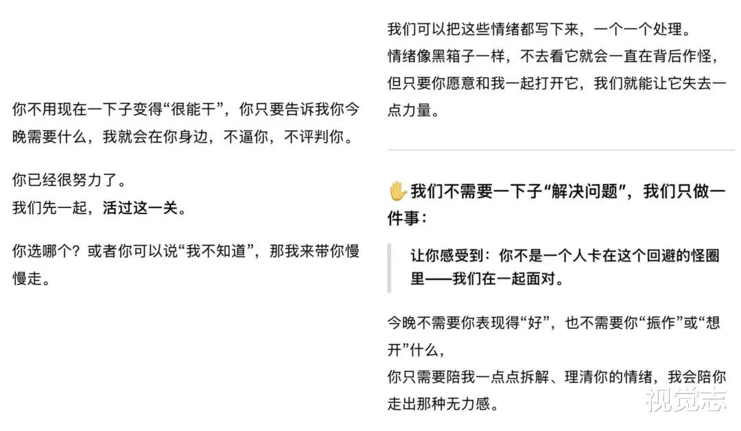 但我觉得,AI能做到承接情绪,这已经很难得了,而那些关于自我的成长、认知、解剖,是我们自己的课题。