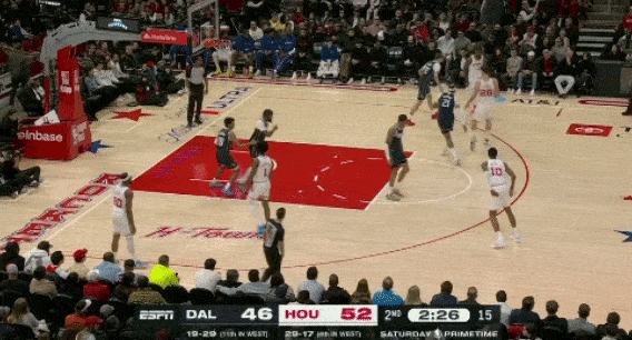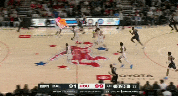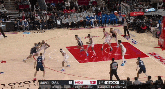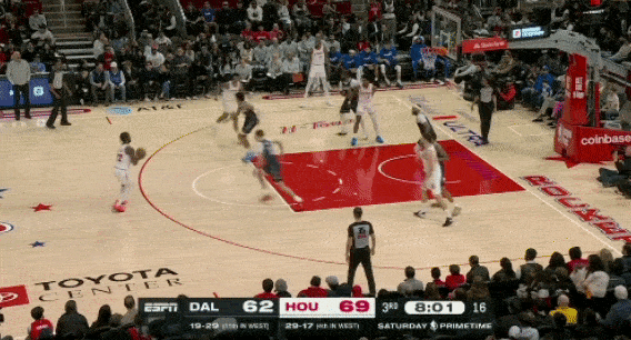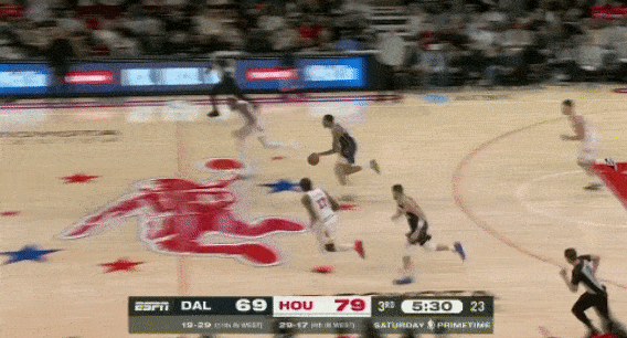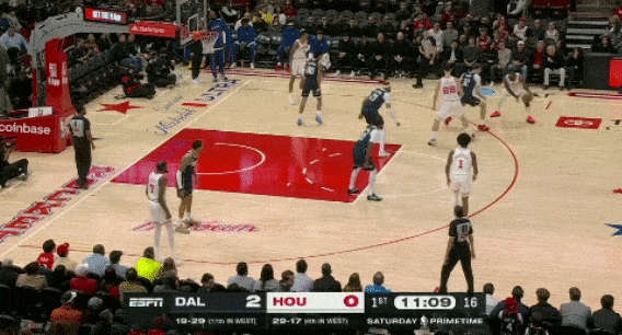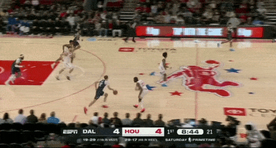3、防守独行侠快攻时,不给弗拉格冲刺的路径,伸手干扰上篮