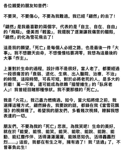 就像她自己在遗书中提到的,她不希望别人看到她痛苦的样子,也不希望自己的离去给家人带来太多的负担。