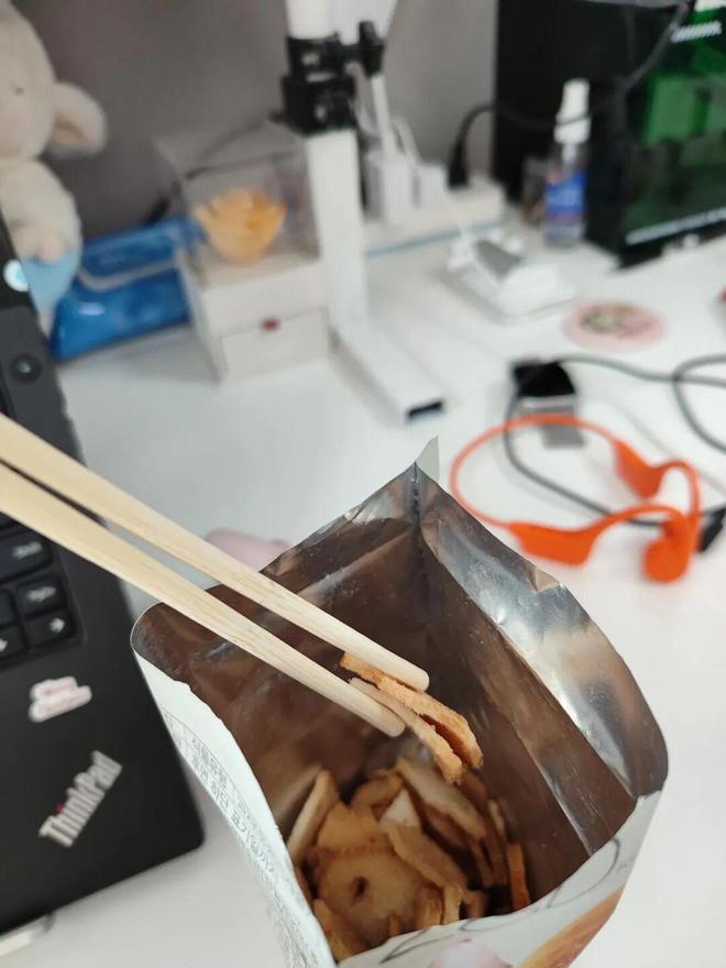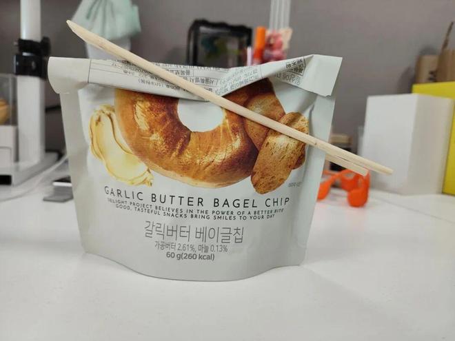 把零食袋卷一下,再找拿一双点外卖送的一次性筷子,然后把它夹住就可以了,下次还可以用筷子吃零食,不脏手。