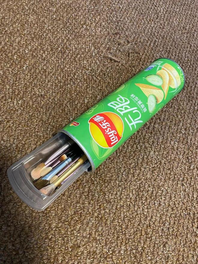 另外,薯片桶也是一个绝佳的化妆刷收纳工具,难看是难看了一点,但放在行李箱里又看不见。