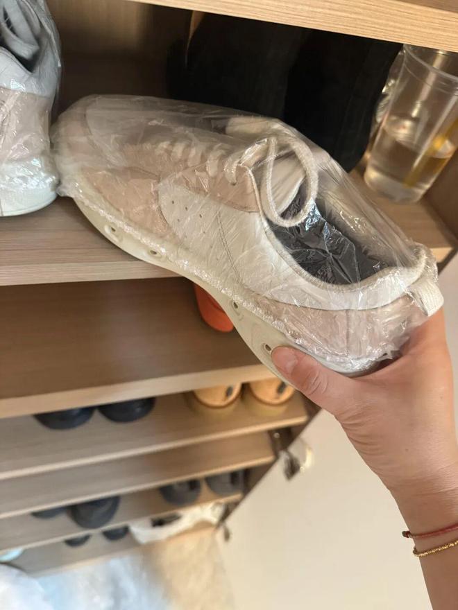 厨房里的保鲜膜套就是最好用的鞋子防尘袋,44码的鞋子都能套进去,记得袋口朝下,可以彻底隔绝灰尘。