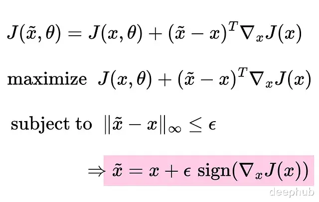 将最大范数约束在ε以内,就能保证改变幅度不被肉眼发现。这就是快速梯度符号法(Fast Gradient Sign Method, FGSM)的核心思路:利用梯度的符号信息来确定移动方向。