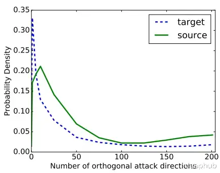 对抗子空间的维度是可以计算的,它表示能用来生成对抗样本的正交方向数量。这些向量和梯度向量之间有较大的点积。