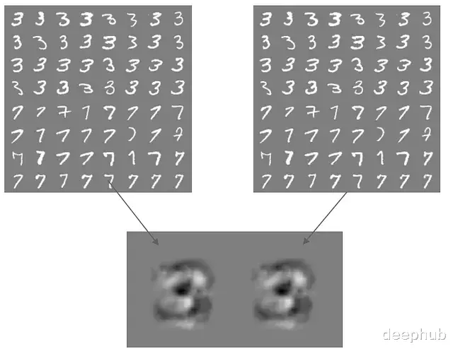 人眼能轻松过滤掉这些图像的背景噪声,但模型会认真对待每一个权重。权重为正时输出7,权重为负时输出3。这些生成的对抗样本彻底瓦解了分类器的判别能力。