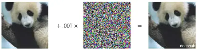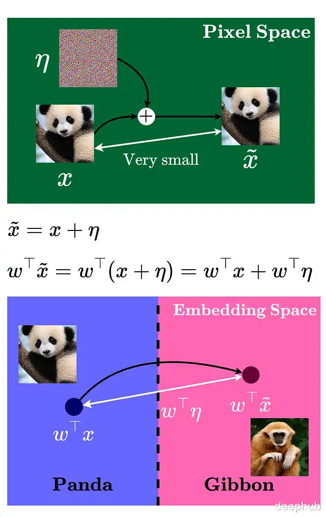 人眼看不出这两张熊猫图像有任何区别,而模型对左图的预测是熊猫,置信度57.7%显得不太确定。中间那张看起来像噪声的图案其实是经过精心设计的扰动掩码,将其乘以一个很小的系数0.007后叠加到原图上。肉眼完全察觉不到变化,但却可以让模型以99.3%的置信度认定右图是长臂猫的图像。
