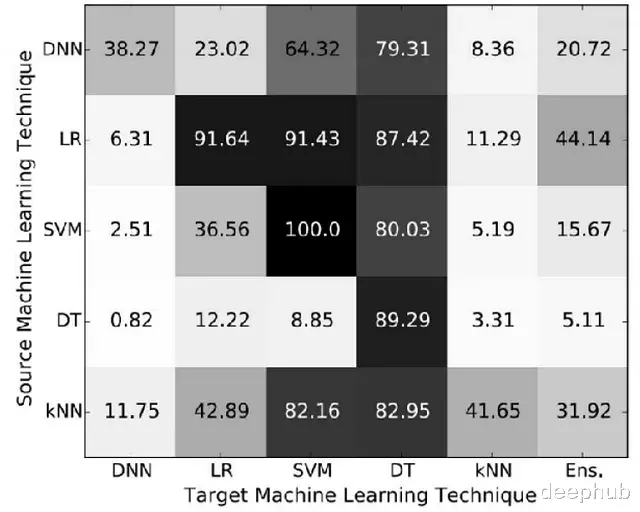 SVM依赖数据特性所以用一个SVM生成的对抗样本很容易攻击另一个SVM,而逻辑回归生成的对抗样本有87.42%的概率能欺骗决策树。