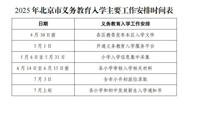 图为2025年北京市义务教育入学主要工作安排时间表。北京市教委供图