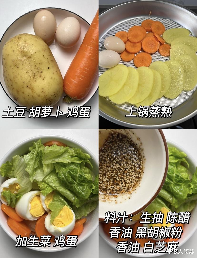 制作这道菜,首先需要准备一个中等大小的土豆、一根胡萝卜、两个鸡蛋以及适量的生菜。土豆和胡萝卜洗净后去皮,切成薄片,这样可以缩短蒸制时间,也能让口感更加细腻。将切好的土豆片和胡萝卜片整齐地摆放在蒸锅的蒸屉上,再将鸡蛋一同放入锅中,开大火蒸约十五分钟,直到土豆和胡萝卜完全熟透,用筷子轻轻一戳就能穿透,鸡蛋也蒸熟定型。这一步是保证成菜口感的关键,蒸制的方式能最大程度地保留食材的原汁原味和营养成分,避免因油炸或翻炒而增加额外的热量。