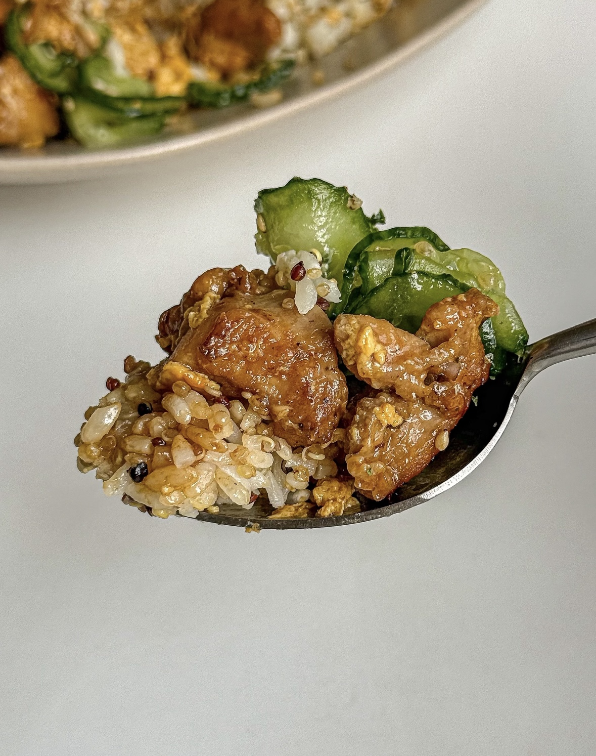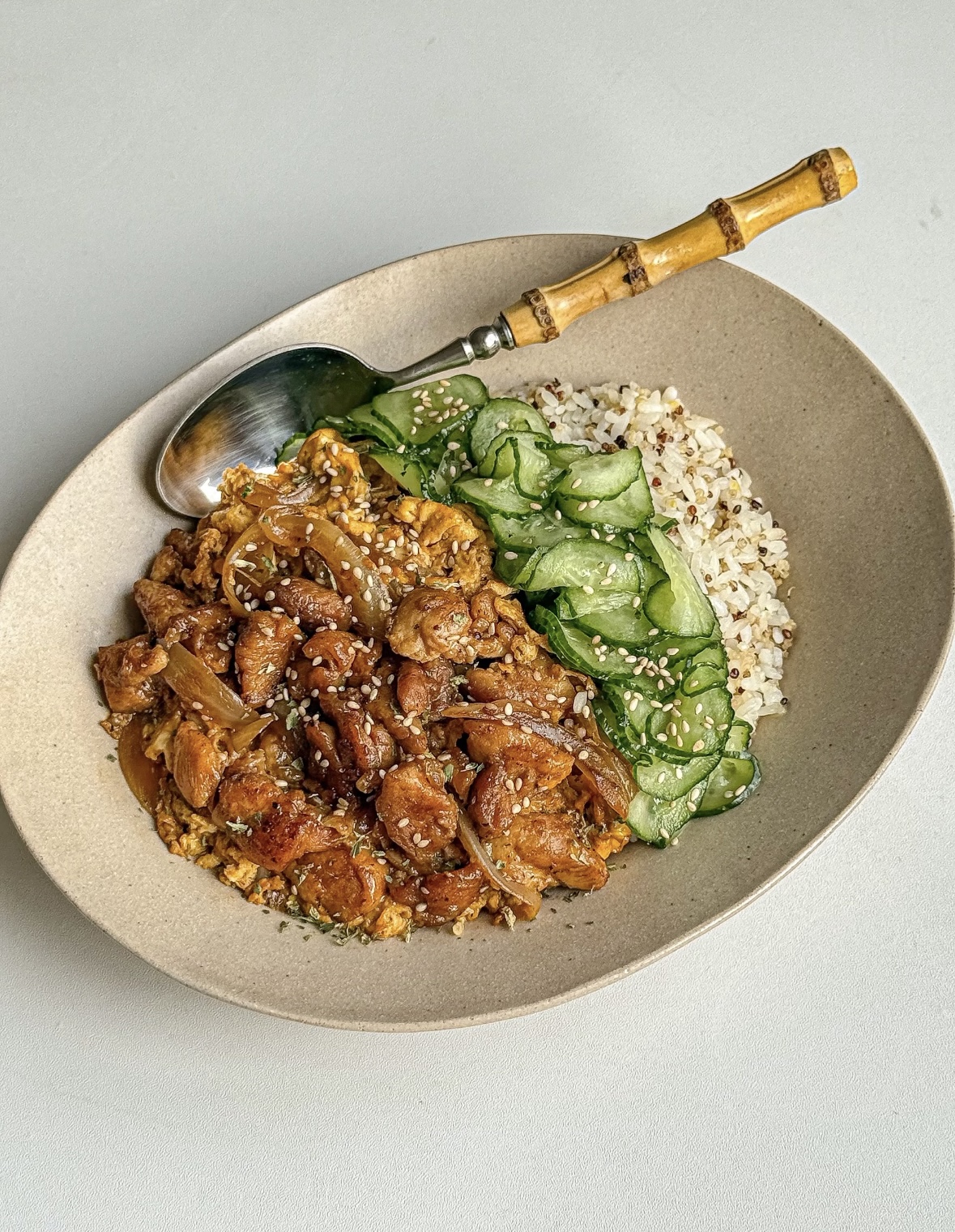 盛饭仪式感拉满:先铺一层杂粮饭,吸汁不软塌;再盖鸡腿滑蛋,让汤汁顺着饭缝渗进去;最后摆上冰镇过的渍黄瓜,撒一把焙香的白芝麻。筷子一挖,米饭吸饱鸡汁,蛋花像丝绸缠住米粒,黄瓜“咔嚓”一声打断油腻,芝麻在齿间开小派对,口感层层叠,像在嘴里放了一场小型烟火。吃完把碗一推,打个带着奶香的嗝,突然觉得加班也没那么苦了——原来幸福就是一只鸡腿、两颗蛋、半根黄瓜,再加一点点愿意为自己动手的耐心。今晚就试试吧,厨房灯一开,你就是这条街最会宠自己的大人!