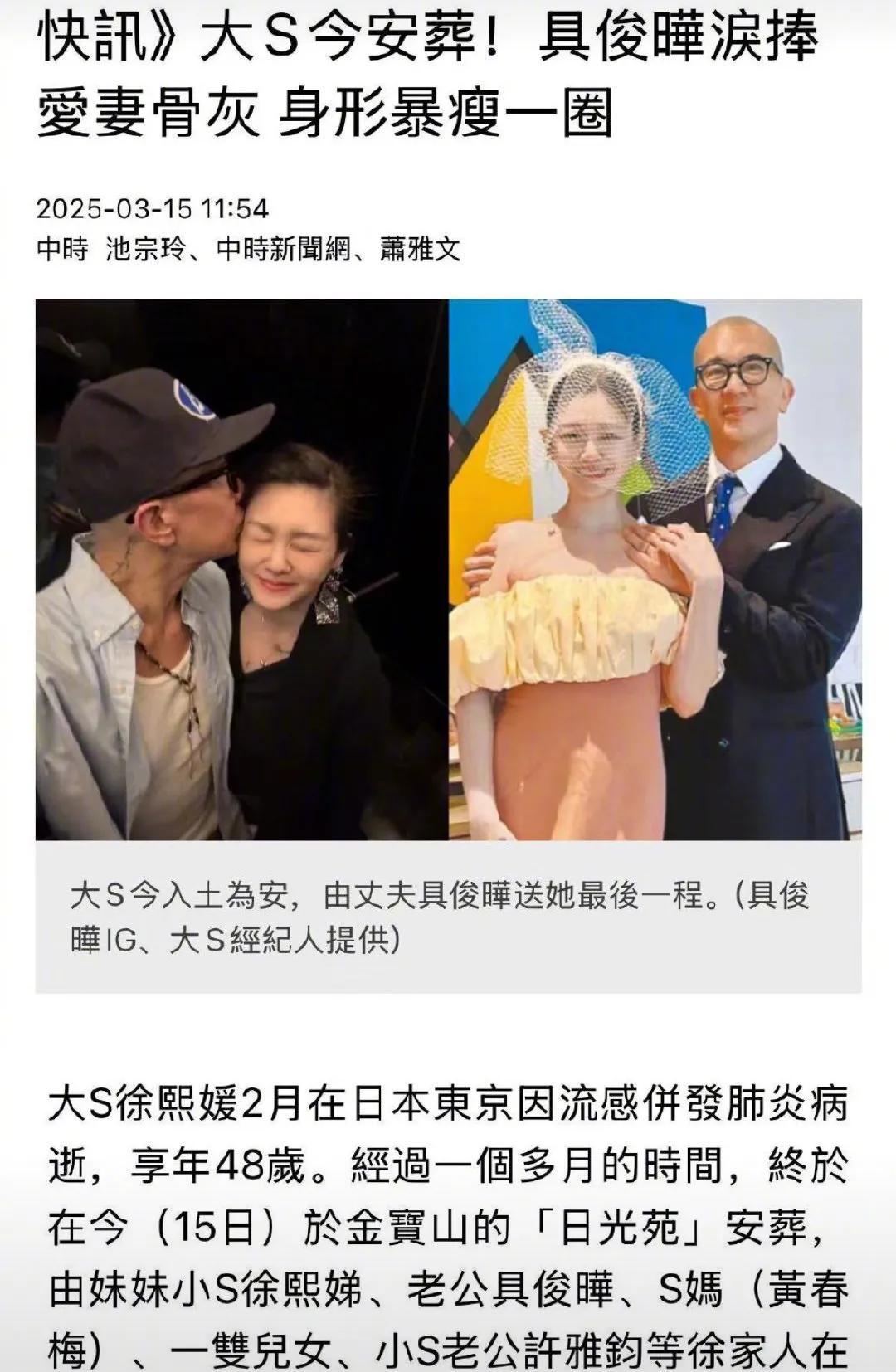 具俊晔则在许雅钧姐姐和工作人员的陪同下,将大S的骨灰从日光苑移至玫瑰园安葬。