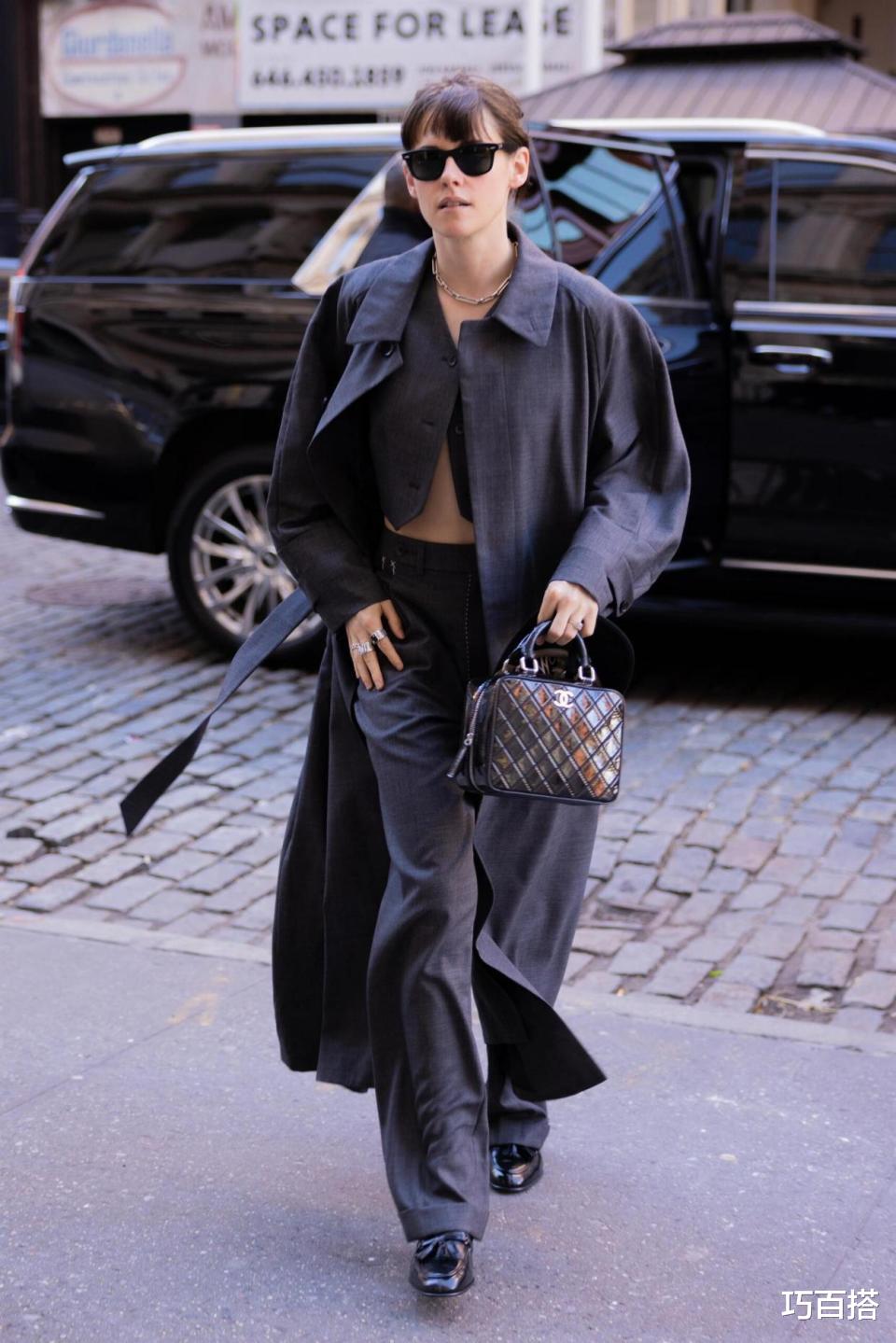 克里斯丁的穿衣打扮很讲究,跟着她的节奏学穿搭,毫不费力就能赚足回头率,jk款西装外套搭配同色系廓形风衣,松弛有度、慵懒个性。