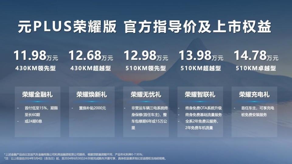 宋Pro DM-i荣耀版&元PLUS荣耀版震撼上市,其中宋Pro DM-i荣耀版售价10.98万元起,令人惊叹,新车共包含5款车型,官方指导价从10.98至13.98万元,全面刷新了A级SUV市场的新标准,同时也开启了“电比油低”SUV系列全新篇章;元PLUS荣耀版共5款车型,售价在11.98至14.78万元;宋Pro DM-i荣耀版&元PLUS荣耀版强势突入10万元级别的A级SUV市场,此举无疑是在性能与性价比上实现了对传统燃油SUV的“电比油低”的绝对优势。