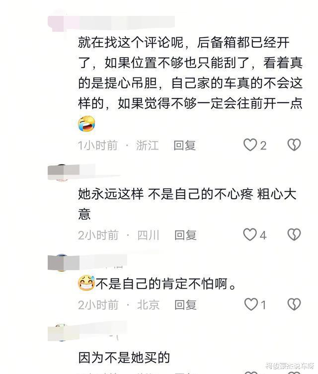 网友们更是坐不住了:“替红姐捏把汗,感觉她真不怕刮到!”“后备箱自动的开就是开了,还试试,看着视频刮了都心疼!”“要是红姐自己家的车肯定不会这么窄开后备箱。” 啧啧啧,这评论,句句扎心啊。