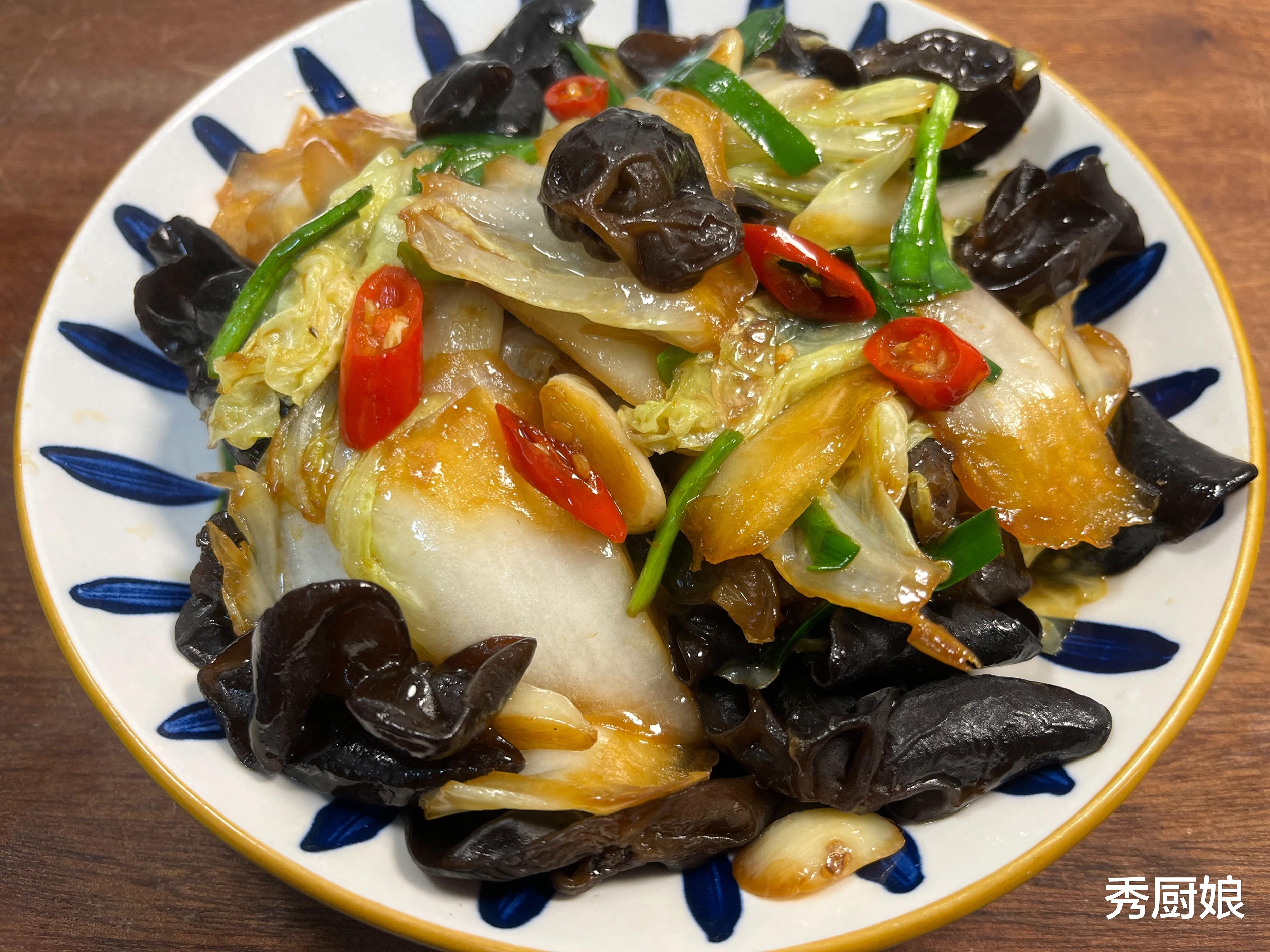 详细步骤:① 木耳提前2小时用温水泡发,去根撕成小朵,开水焯1分钟捞出;② 白菜帮子斜刀切片,叶子撕块分开备用;③ 热锅凉油爆香蒜末,先下白菜帮大火翻炒1分钟;④ 倒入木耳和白菜叶,加生抽、盐快速翻炒;⑤ 白菜变软后淋香油,出锅!