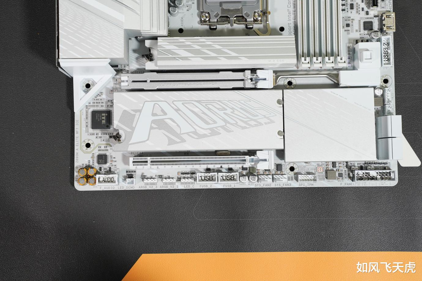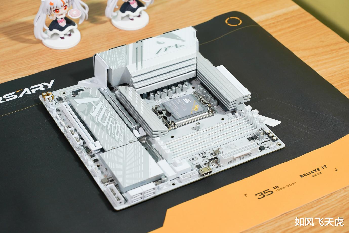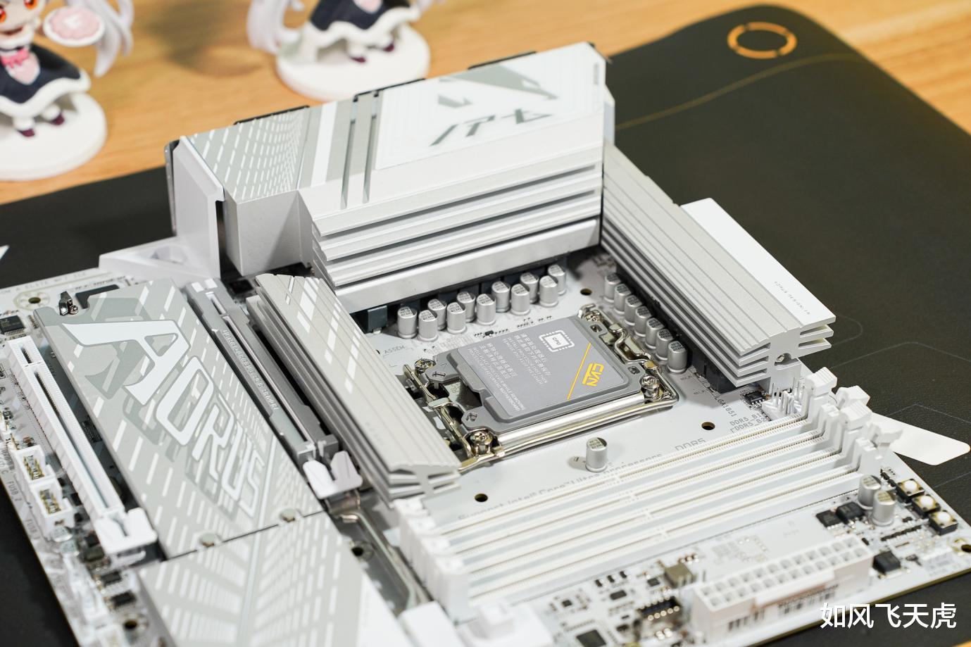总的来说,这款技嘉 Z890M AORUS ELITE WIFI7 ICE 主板的表现还是不错的。首先我们看它是一款全白色色系的主板,从底色、马甲、端子、内存插槽、按钮等都是白色色系的,同白色主题非常搭配。同时虽然是白色系,也有一定的变化,同时还有图案,这样整体不单调。