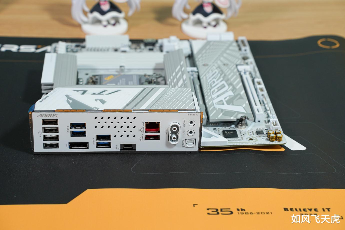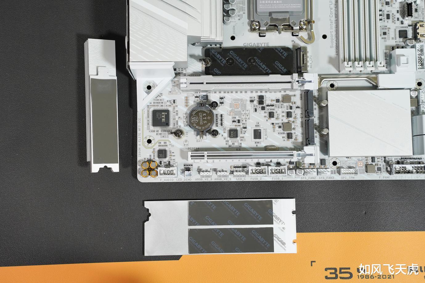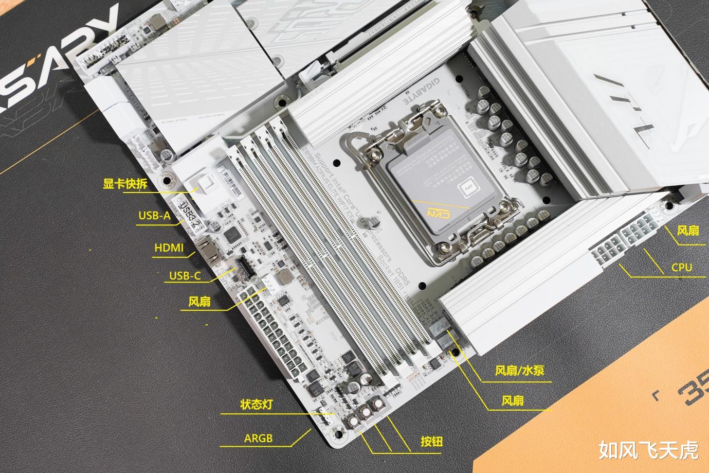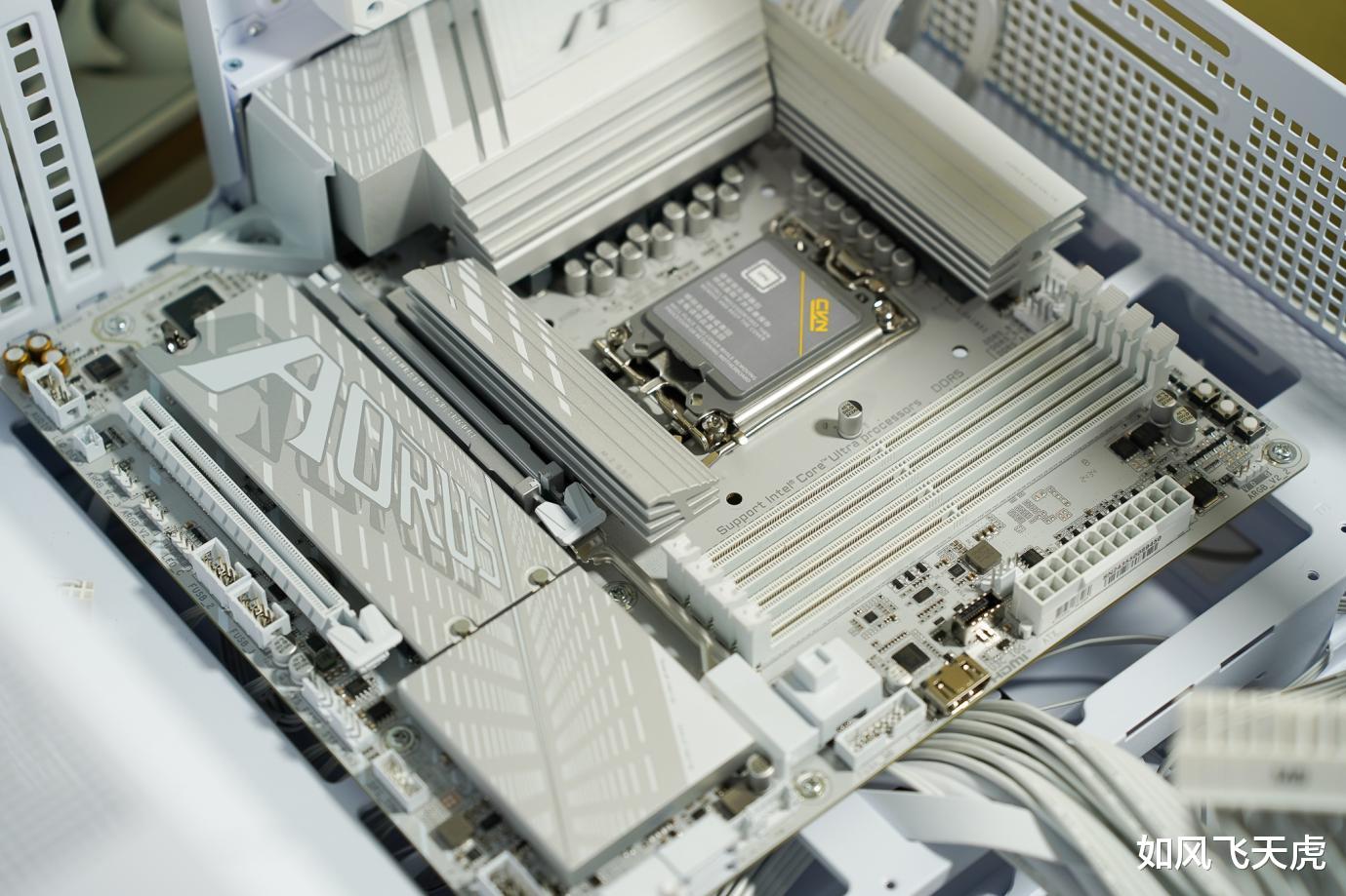 总的来说,这款技嘉 Z890M AORUS ELITE WIFI7 ICE 主板的表现还是不错的。首先我们看它是一款全白色色系的主板,从底色、马甲、端子、内存插槽、按钮等都是白色色系的,同白色主题非常搭配。同时虽然是白色系,也有一定的变化,同时还有图案,这样整体不单调。