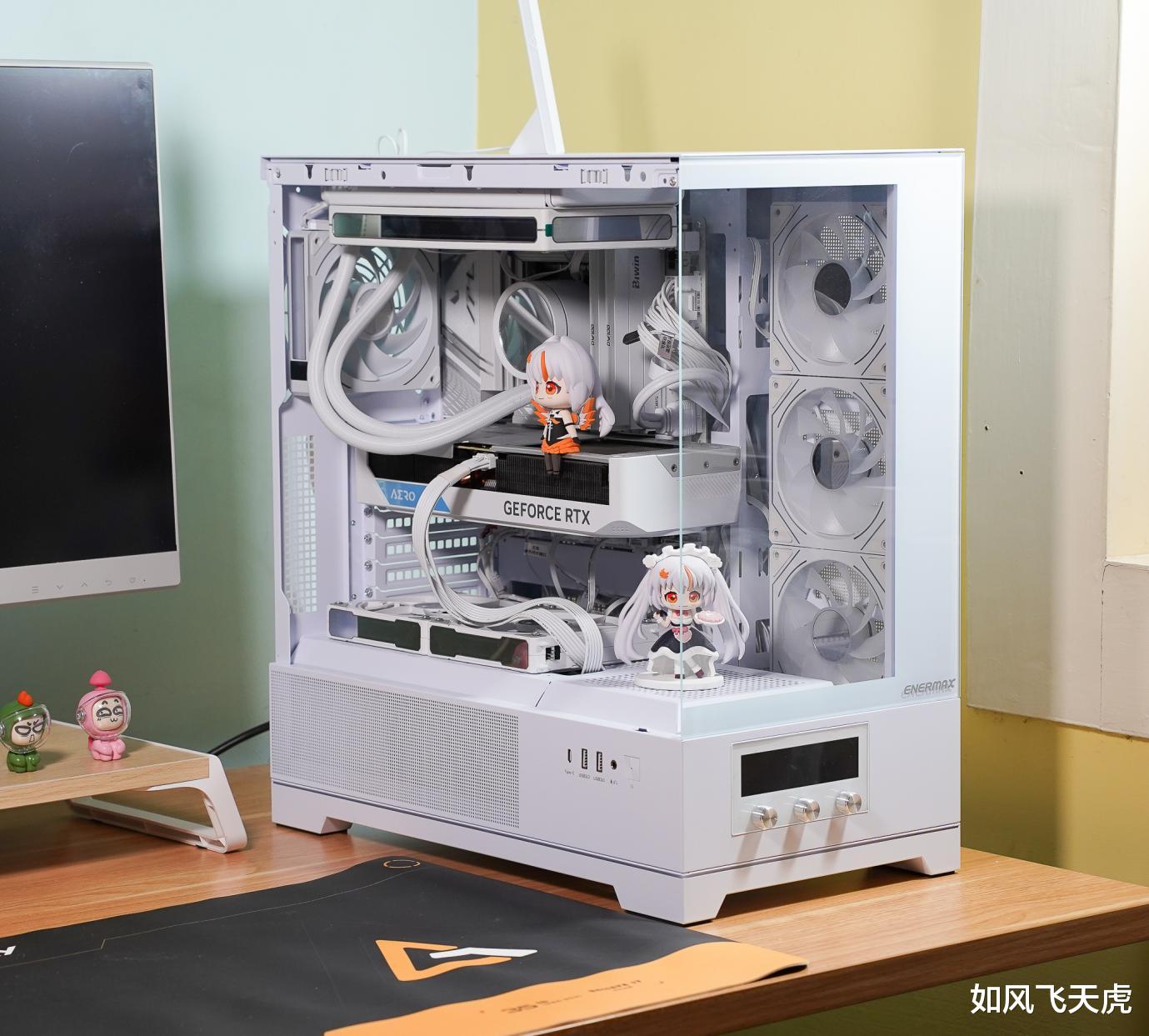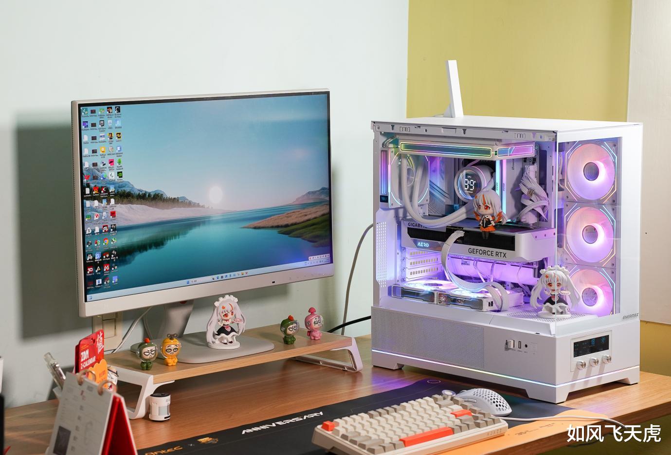 显卡是技嘉的4070Ti雪鹰,非常漂亮。显卡供电采用12V-2x6,连接简单方便。左侧AERO字样是支持ARGB的,可以变换不同颜色显示。机箱是安耐美的D58 Pano,一款白色海景房机箱,最大支持ATX主板。机箱的侧面底部有USB插口和按钮,机箱放在桌面的时候,使用USB口非常方便。机箱面板带有显示屏和控制按钮,可以控制风扇转速和彩光方案。