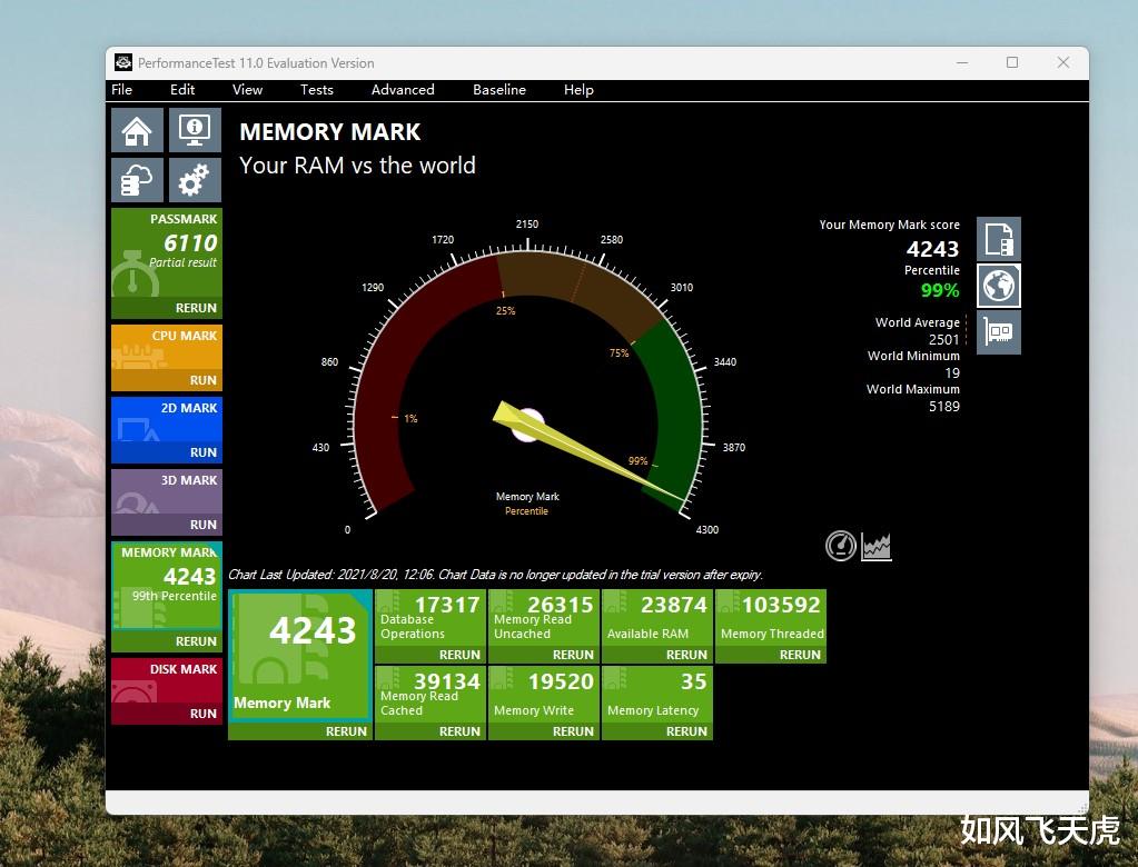 Performance Test内存测试,总分4243分,排名99%,比起默频的3777分提升了不少。