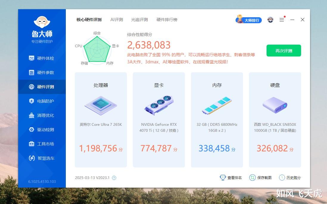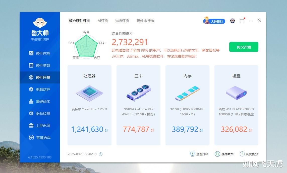 跑一个鲁大师,CPU是1,198,756,内存是242,217,显卡是774,787,硬盘是326,082,总分是2,541,842。