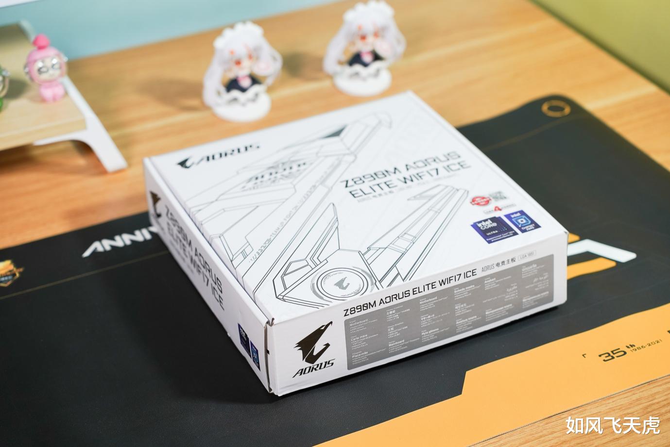 产品的包装盒依旧是冰雕系列传统的白色,右下角有Intel的标记,右侧有产品型号Z890M AORUS ELITE WIFI7 ICE。