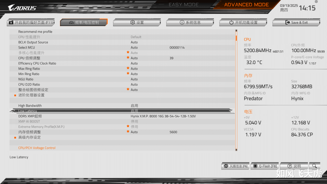 我们进入到技嘉的BIOS里面,还是在简易模式的左下角,有个High Bandwidth选项和下面一个是Low Latency选项,翻译中文就是高带宽和低延迟,是在内存频率不变的条件下,可以继续提升内存的表现的。我们将这2个功能启用并保存重启电脑。