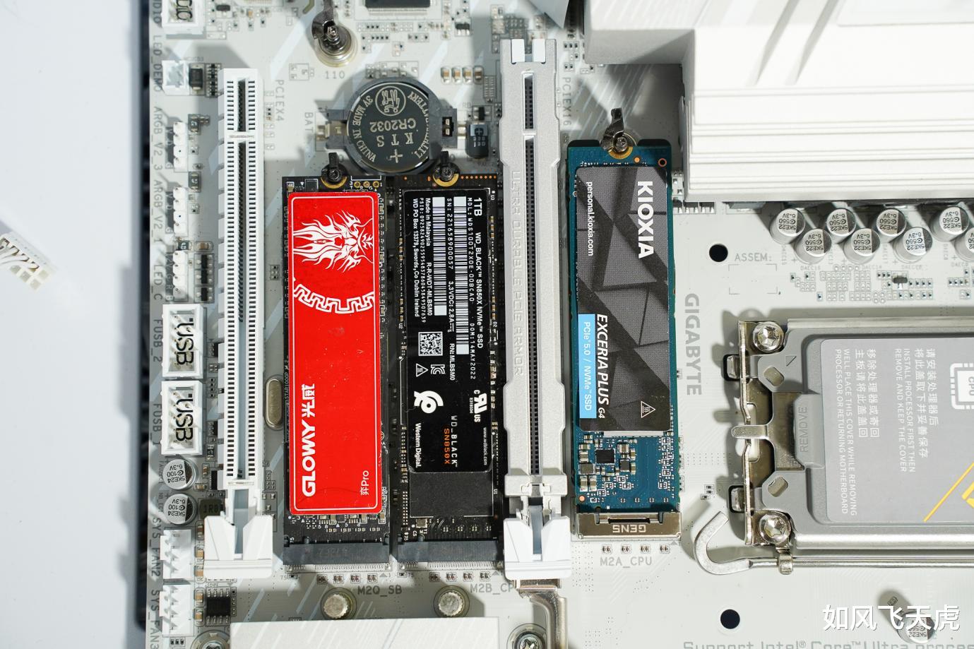 取下散热马甲,可以看到有3个M.2插槽位置,,带有散热垫,具有M.2快拆设计。第一个插槽支持PCIe 5.0x4,第二个M.2插槽支持PCIe 4.0x4,均来自CPU直出。第三个插槽支持PCIe 4.0x4,来自南桥。