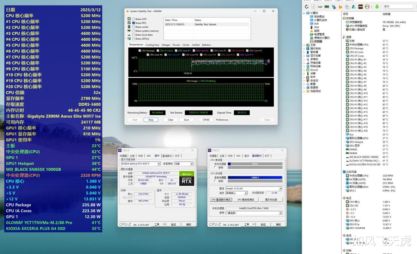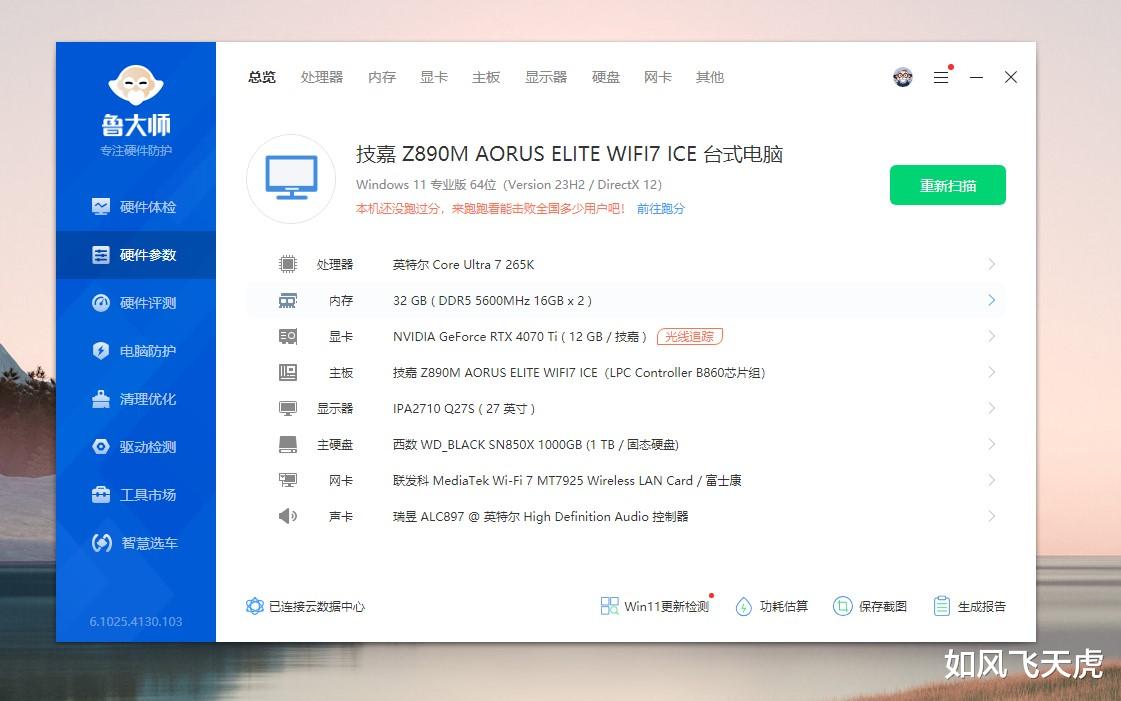 我们来看下电脑的配置,CPU是英特尔U7 265K,内存是佰维DDR5 32GB,显卡是技嘉RTX 4070Ti雪鹰,主板是技嘉Z890M AORUS ELITE WIFI7 ICE,显示器是攀升Q29S。