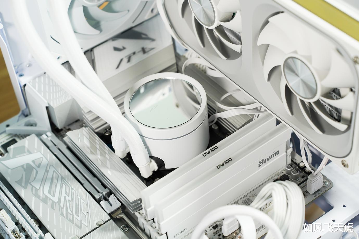 CPU是 U7 265K,内存是佰维DW100 DDR5内存,白色灯条。DW100使用了全覆盖的铝合金压铸马甲,搭配高性能散热垫,包括PMIC都有专属导热垫,给予内存超频更强大的散热保护。它使用了10层PCB,从而拥有更好的电气性能,可以有效减少电磁干扰。而且它还搭配了独立的PMIC芯片,不锁电压,更有利于超频。由于U7 265K的发热不是很高,所以配个240水冷就可以了。