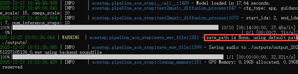 可以在软件后台查看当前的执行进度,程序处理完毕会输出信息save_path is None,生成的音乐默认保存在项目路径的“outputs”文件夹下,也可以在“输出界面”的右上角点击下载