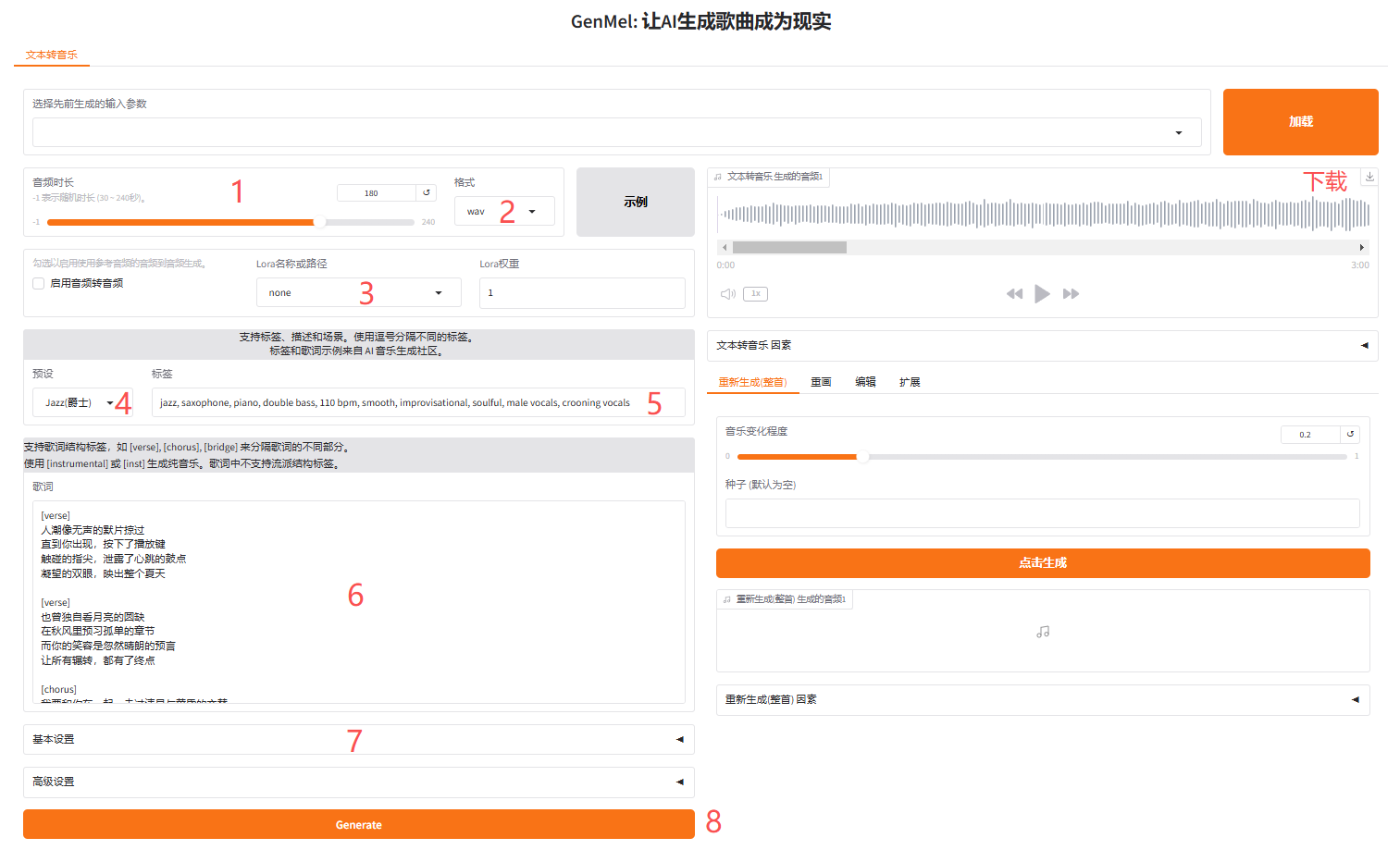 注意使用结构标签:[verse]是主歌部分,[chorus]是副歌部分,[bridge]为桥段,输入[instrumental]或[inst]生成纯音乐