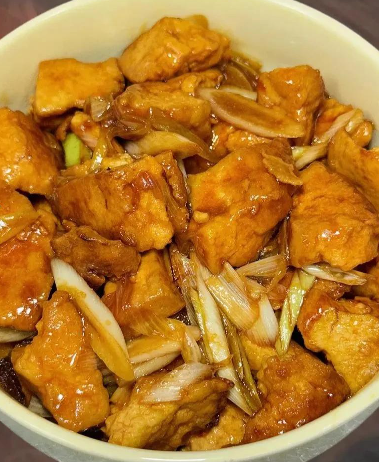 简单的豆腐,在小学煸炒后,淋上调随酱汁,小火焖煮几分钟,葱香飘逸而出,豆腐吸饱汤汁,入口即化。