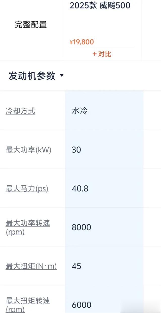 虽然是叫威飚500,但实际排量并没有这么大,搭载的是一台465.4cc V型双缸每缸两气门水冷发动机,最大功率30kW/8000rmp,最大扭矩45N.m/6000rmp,折合马力40.8Ps。这个动力在同级别虽然不算优秀,但也不是同价位的250/300能够相比的。