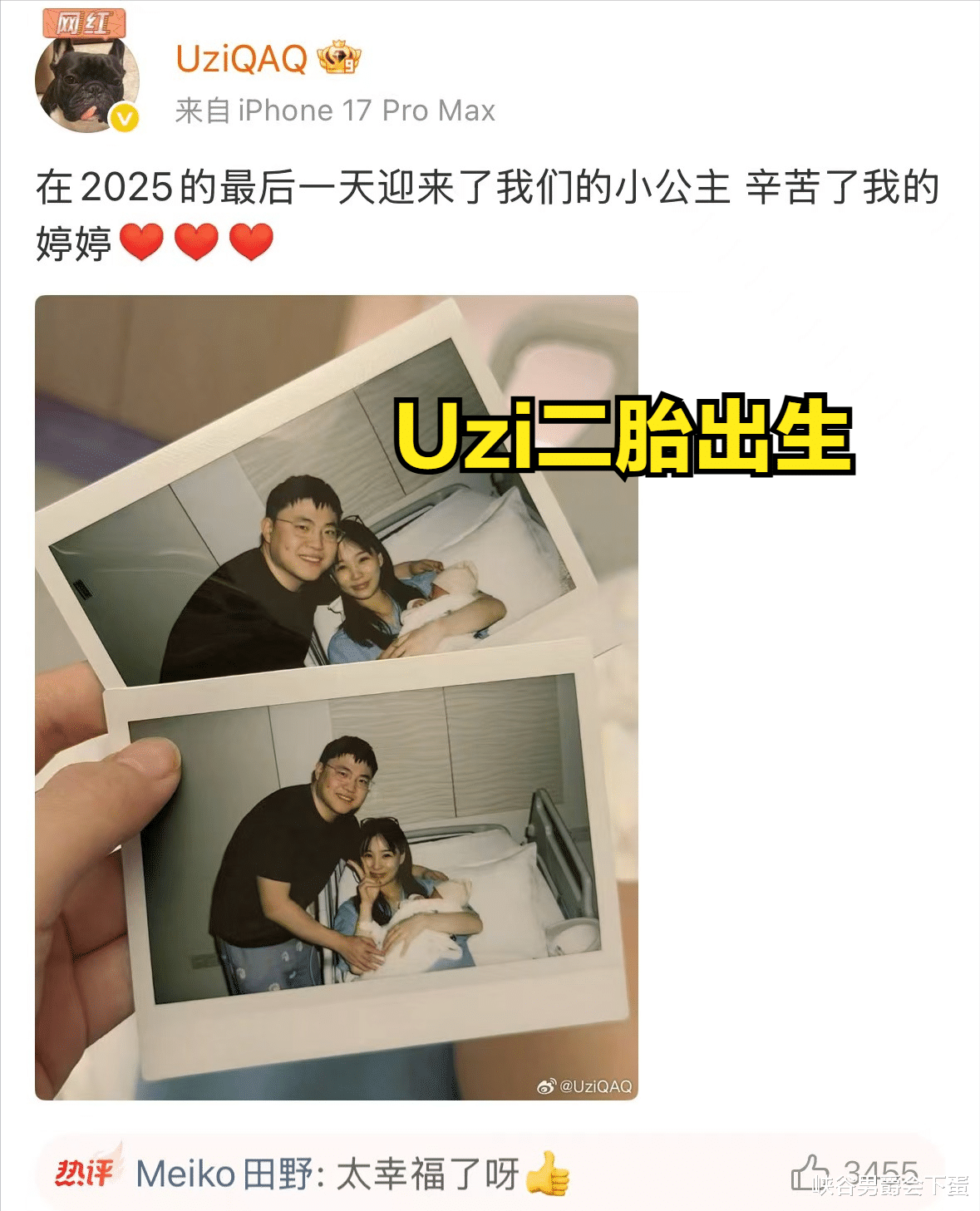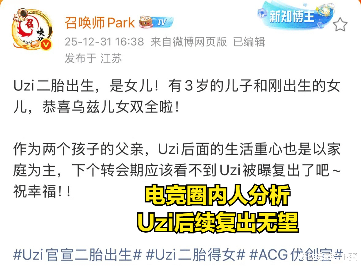 在2025年的最后一天,Uzi在社交平台发文说道:在2025的最后一天迎来了我们的小公主,辛苦了我的婷婷。此贴发布后就登上了热搜的榜单,随后很多职业选手接连送去了祝福,其中包括Meiko、刘青松、小明、Jackeylove等等,如今的Uzi可以说是家庭幸福美满。