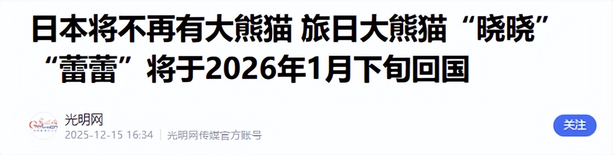 光明网——2025年12月15日——日本将不再有大熊猫 旅日大熊猫“晓晓”“蕾蕾”将于2026年1月下旬回国