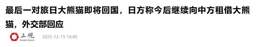 上观新闻——2025年12月15日——最后一对旅日大熊猫即将回国,日方称今后继续向中方租借大熊猫,外交部回应