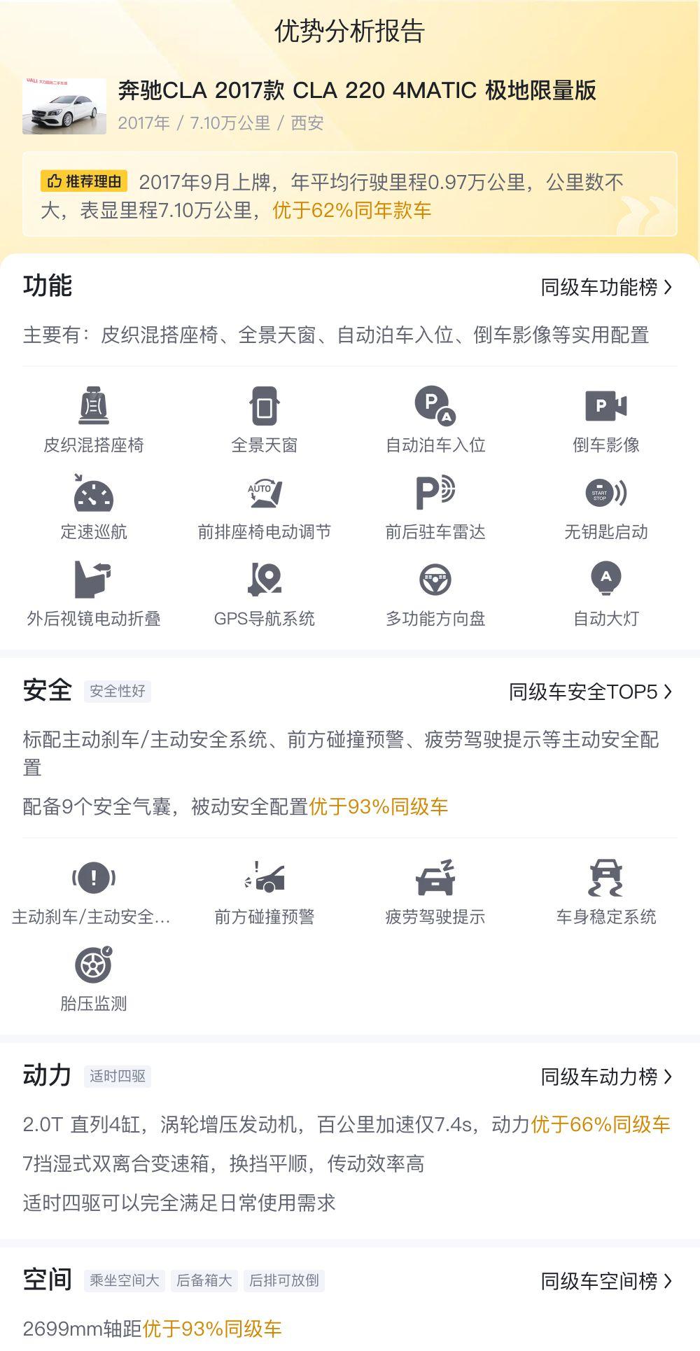 配置方面,这辆CLA配备了全景天窗、自动泊车、倒车影像、主动刹车、前方碰撞预警等功能。在2017年,这些配置或许算得上是亮点,但如今,很多十万级别的国产车都已经标配了这些功能,甚至更加先进。所以,不要被这些看似丰富的配置所迷惑,要根据自己的实际需求进行判断。例如,你是否真的需要自动泊车功能?你是否更在意车机系统的智能化程度?