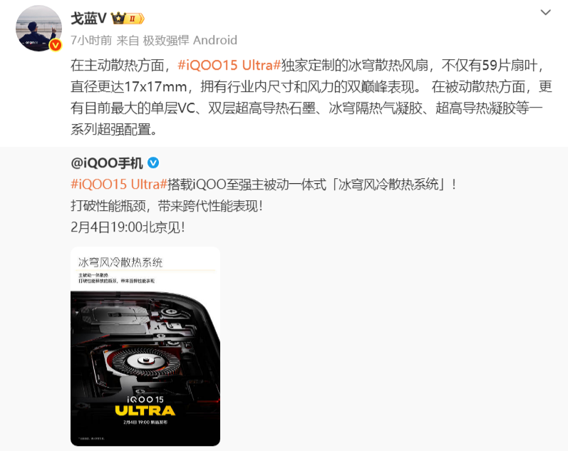 继 @iQOO手机 官宣了iQOO 15 Ultra将定档2月4日发布、搭载高通第五代骁龙8至尊版处理器+Q3自研电竞芯片以及该机的外观透视图和主动散热风扇的构造等信息之后,日前,官方持续发布该机的预热海报,详细介绍了该机还将配备冰穹风冷散热系统的信息。同时,iQOO产品经理 @戈蓝V 不但对预热信息进行了补充,还发长文解读了该机“重构四大Ultra体验”的亮点。