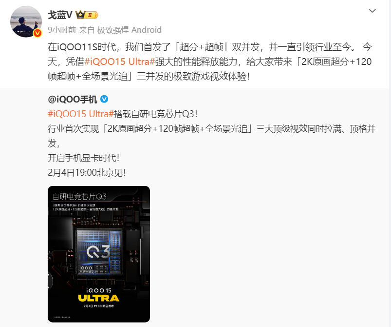 继 @iQOO手机 官宣了iQOO 15 Ultra将定档2月4日发布、搭载高通第五代骁龙8至尊版处理器+Q3自研电竞