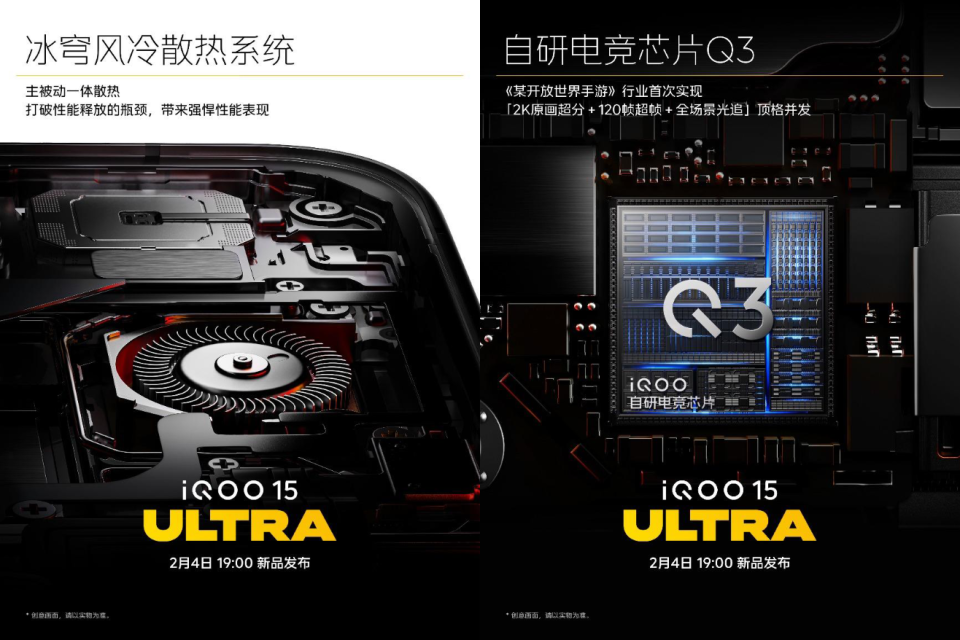 日前, @iQOO手机 持续发布了两张iQOO 15 Ultra的预热海报,并配文称,“#iQOO15 Ultra#搭载iQOO至强主被动一体式「冰穹风冷散热系统」!打破性能瓶颈,带来跨代性能表现!”“#iQOO15 Ultra#搭载自研电竞芯片Q3!行业首次实现「2K原画超分+120帧超帧+全场景光追」三大顶级视效同时拉满、顶格并发,开启手机显卡时代!”