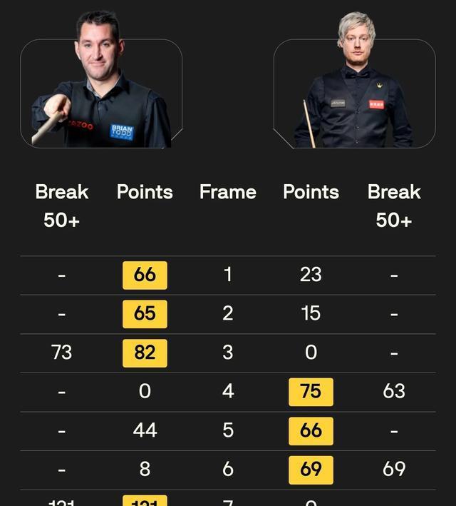 另一边,一场惊心动魄的“天王山之战”正在上演。汤姆·福德与尼尔·罗伯逊两位顶尖高手狭路相逢,贡献了一场跌宕起伏的比赛。双方展现出精湛的球技和强大的心理素质,比分一路紧咬,直至决胜局。关键时刻,福德顶住压力,打出一杆技惊四座的131分,以4-3绝杀罗伯逊,惊险晋级。这场比赛无疑是当晚最精彩的对决之一,让球迷们大呼过瘾。