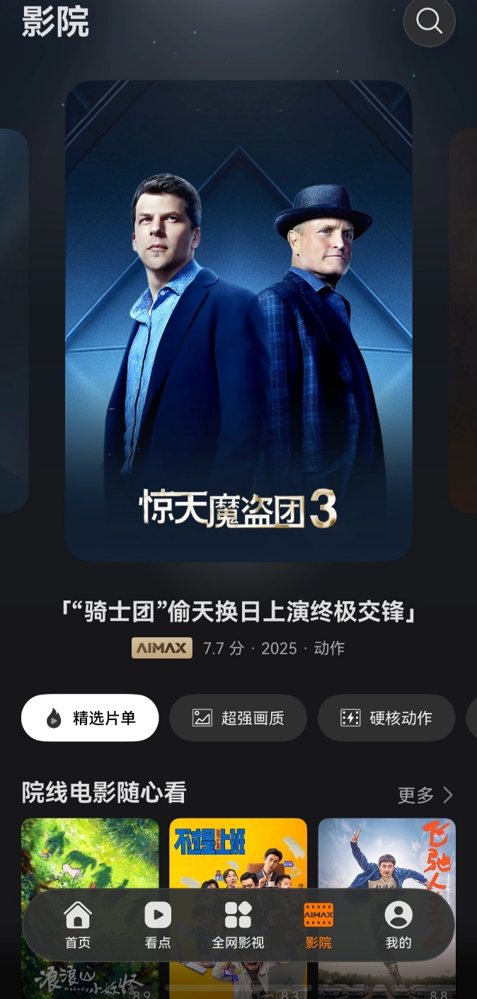 光有好片源还不够,画质音效也得跟上。打开华为视频特有的AiMax影院,配合Pura X Max的屏幕,画面质感拉满。不仅支持最高4K高清画质,还有HDR Vivid和Audio Vivid双技术加持。简单来说,就是画面明暗层次更丰富,色彩更通透真实,自带身临其境的沉浸感。就拿《惊天魔盗团3》来说,观看时能清楚欣赏到暗场下华丽的魔术细节,阿布扎比追逐戏中引擎声从耳边呼啸而过,在移动端就能享受媲美私人影院的视听质感。