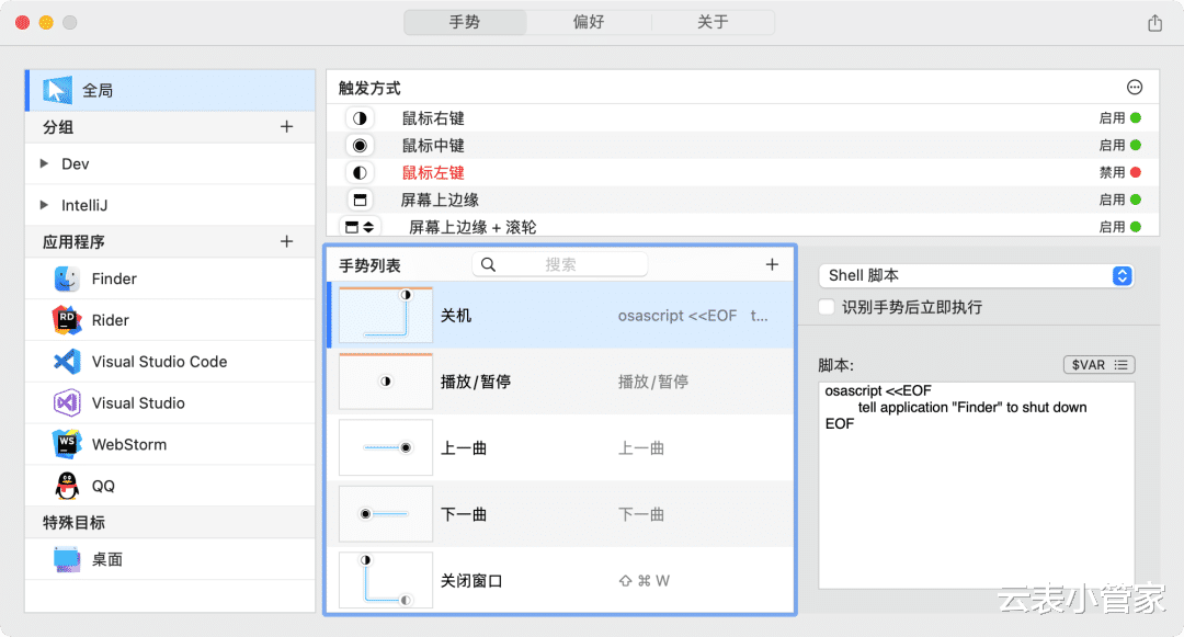 支持针对不同软件设置不同手势。比如在浏览器里画手势是标签页操作,在PS里画手势就是图层操作。完全免费开源,界面极简,没有广告。